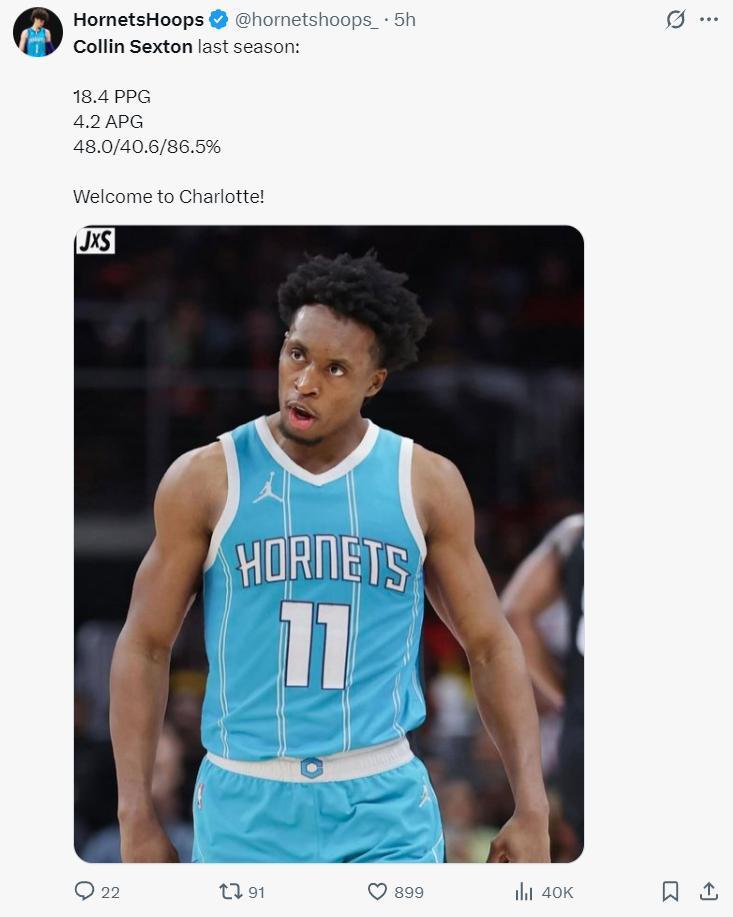 塞克斯頓上賽季場均18.4分4.2助攻,命中率48%,三分命中率40.6%,他來到黃蜂后會搭檔拉梅洛一同先發。