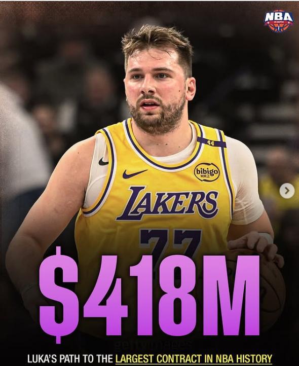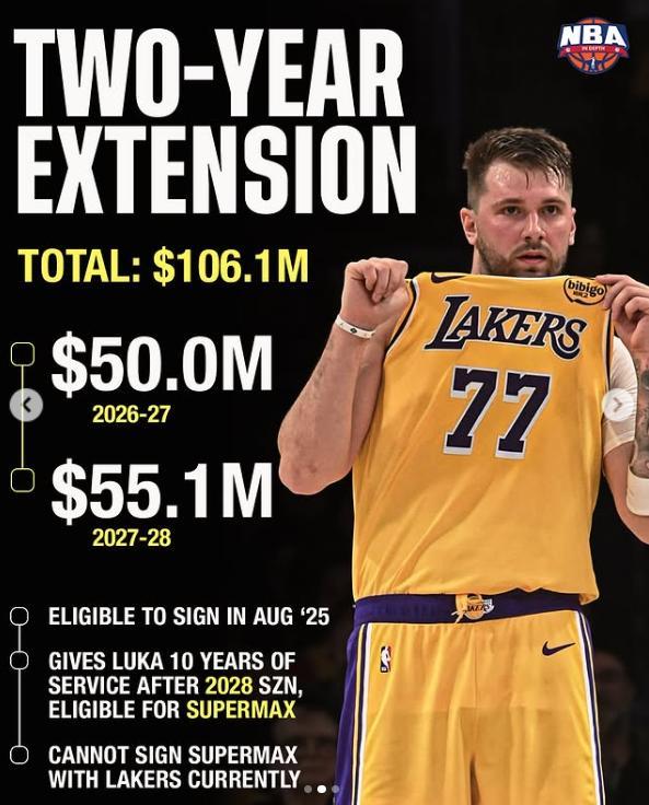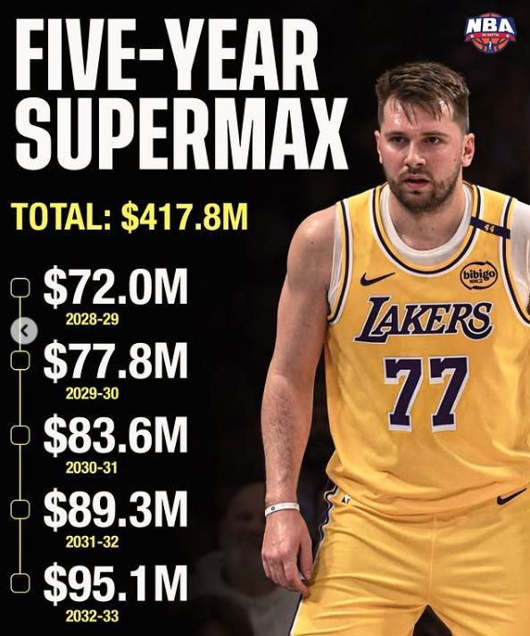 東契奇29歲跳出合同後他可以與湖人重籤一份五年4.18億的超級頂薪,屆時他可以用10年老將的身份去2028年簽下佔工資帽35%的頂薪,均薪高達8036萬。