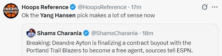 美媒HR寫道:OK,開拓者爲什麼要選楊瀚森,這一切都變得合理了。