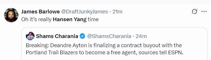 根據幾天前美記Brett的報道,開拓者一直都在努力兜售艾頓與羅威。如今艾頓沒有送走直接買斷了,估計羅威有一定的交易前景所以還在談判,楊瀚森下賽季或許不只是輪換而已,他可能要與克林根競爭一個先發中鋒的席位了。