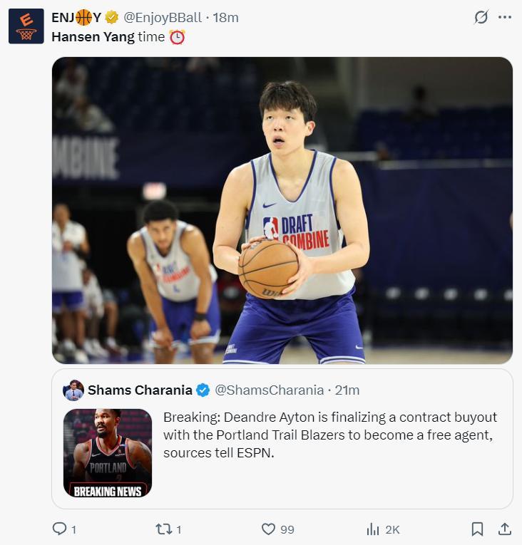 美媒ENJY:看起來接下來都是楊瀚森時間了。