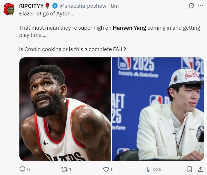 美媒Ripcityy寫道:開拓者買斷了艾頓,這意味着他們對楊瀚森進入球隊主力輪換非常期待,克羅寧這是完美運作?還是一個完敗之作?