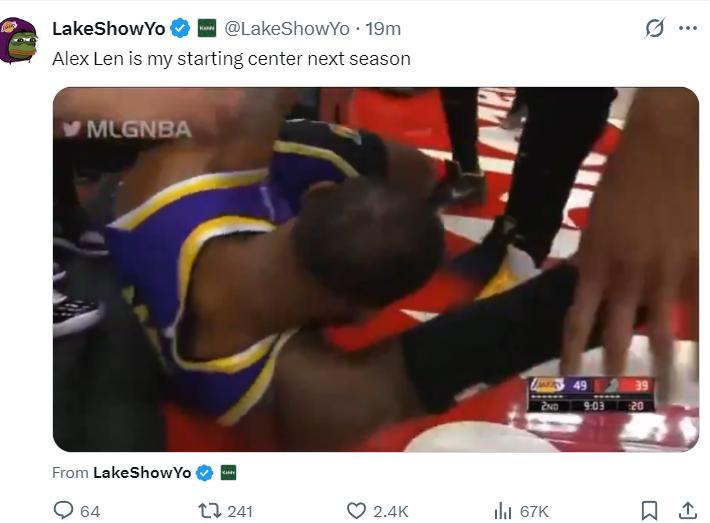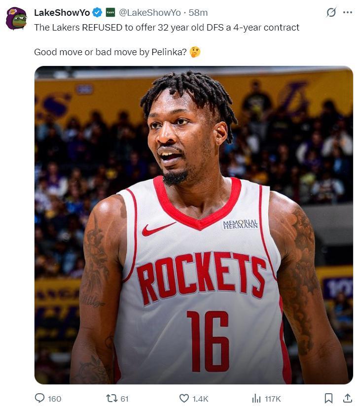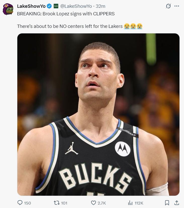 湖媒Laker Showyo寫道:大洛跟快船達成協議了,湖人就快沒有中鋒可以簽約了,三個哭臉。
