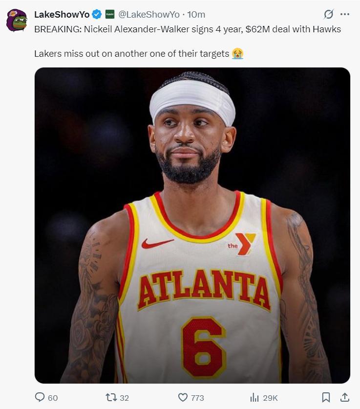 緊接着老鷹以四年6200萬簽下了亞歷山大-沃克,沃克是湖人已經追逐了兩週多的側翼,因爲湖人太需要這樣的防守型球員,結果又被截胡了。
