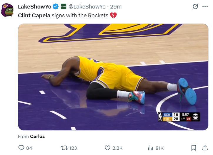 湖媒:卡佩拉重返休斯頓了,心碎,詹皇倒地痛苦。