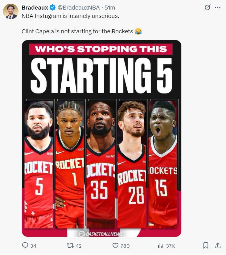 他曬出申京打四號位的陣容,卡佩拉打先發五號位,他暗示畫面太美自己都不敢看。