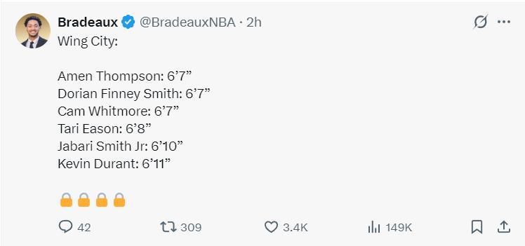 火箭已經組建了聯盟最強的鋒線羣,6個鋒線身高都在2米以上——阿門-湯普森2.01米、卡姆-惠特莫爾2.01米、芬尼史密斯2.01米、塔裏-伊森2.03米、小賈巴里-史密斯2.08米、凱文-杜蘭特2.11米,均高達到恐怖的2.04米!
