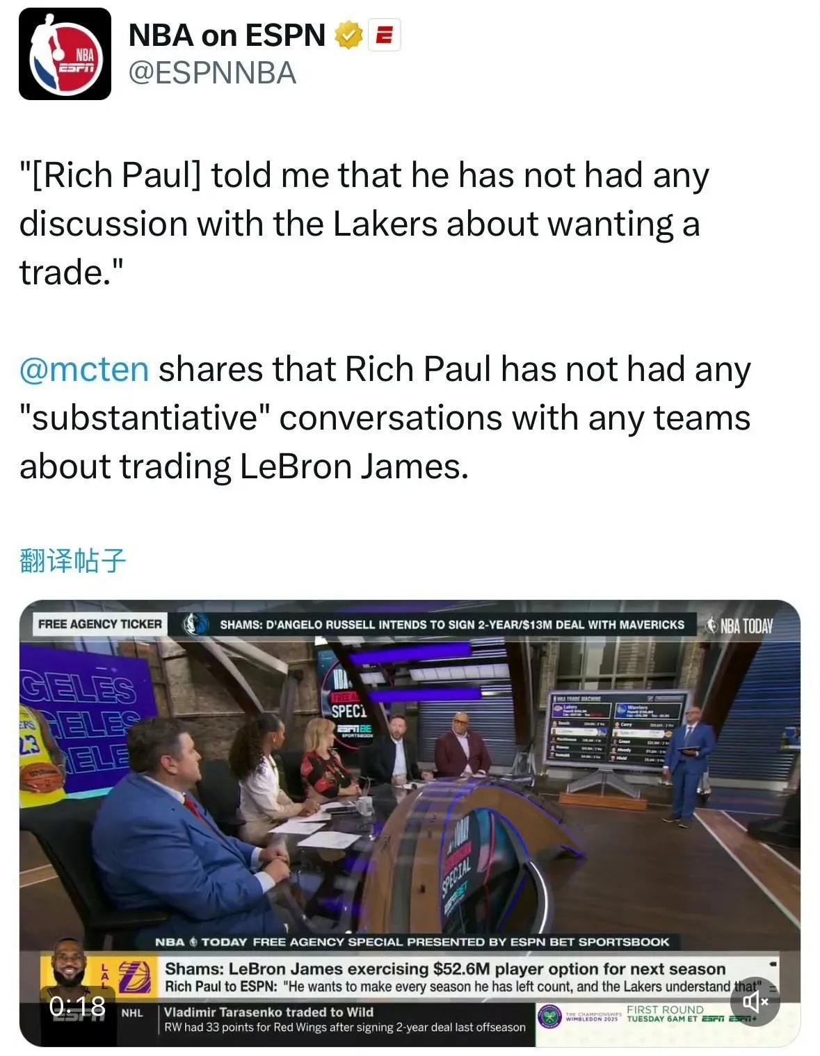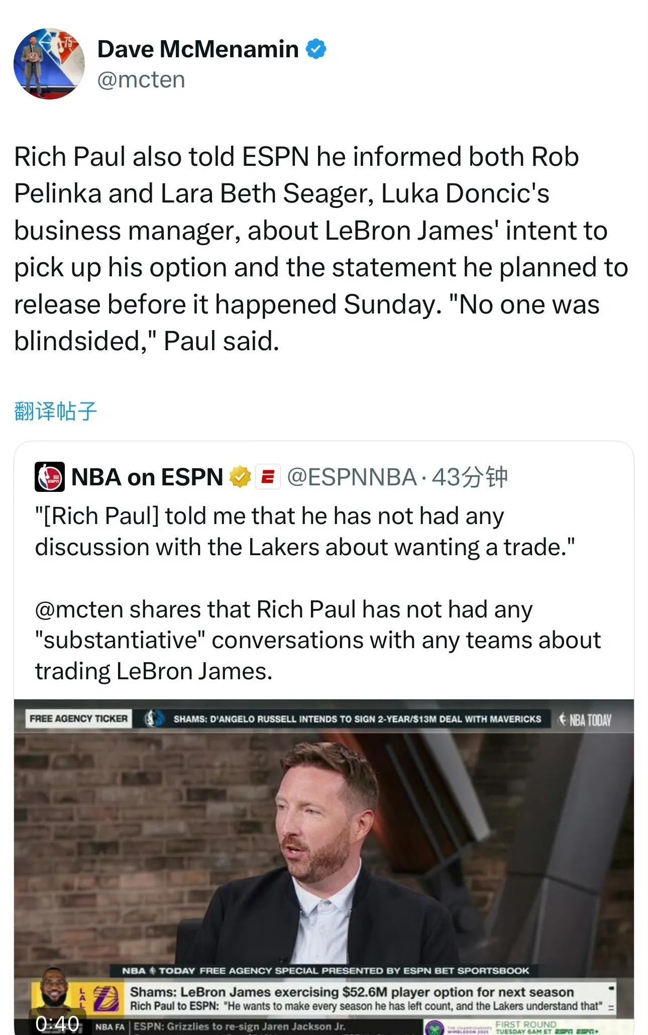 此前,勒布朗-詹姆斯趕在球員選項截止日前,宣佈自己將執行2025-26賽季與湖人隊的合約,下個賽季老詹的年薪將達到創歷史的5260萬美元,這幾乎堵死了湖人隊繼續補強的空間。隨後,詹姆斯的經紀人裏奇-保羅也對外宣稱,他已經與湖人管理層和盧卡-東契奇的經紀人取得了聯繫,告知他們詹姆斯將執行下個賽季的球員選項,同時裏奇-保羅還意味深長的表示:“他(詹姆斯)希望自己剩下的每一個賽季都有所作爲,而湖人對此完全理解、全力支持,並始終把他的利益放在首位。”