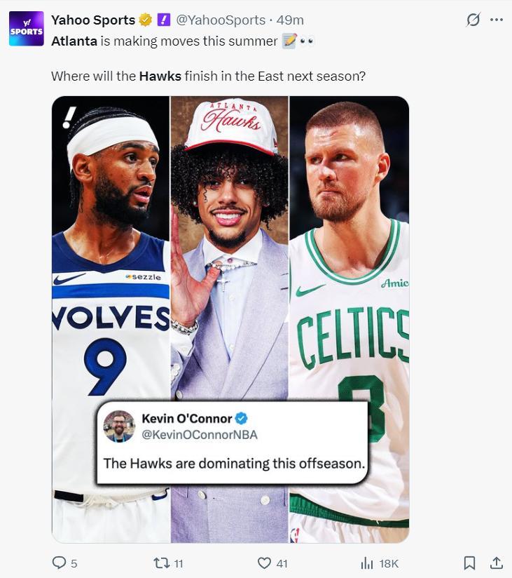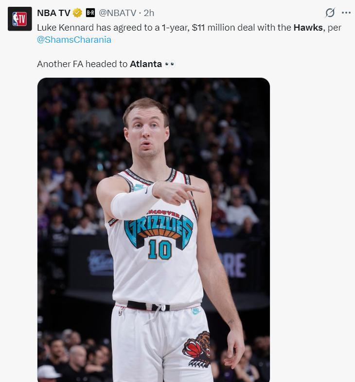 除此之外,老鷹還用一年1100萬的合同簽下了投手盧克-肯納德,上賽季肯納德三分命中率高達43.6%排在聯盟第六位。