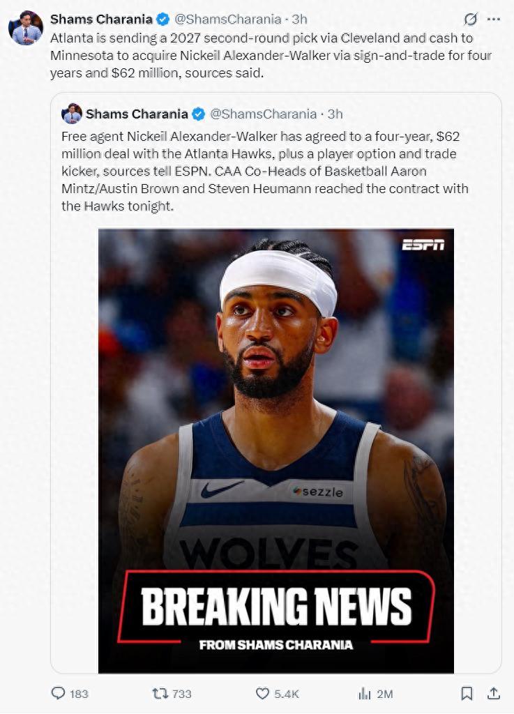 北京時間7月1日,ESPN報道,自由球員亞歷山大-沃克與亞特蘭大老鷹達成加盟協議,這份合同是四年6200萬,隨後Shams透露這是一筆先簽後換,老鷹會將一個2027年的次輪籤(來自騎士)與現金送給森林狼得到沃克。