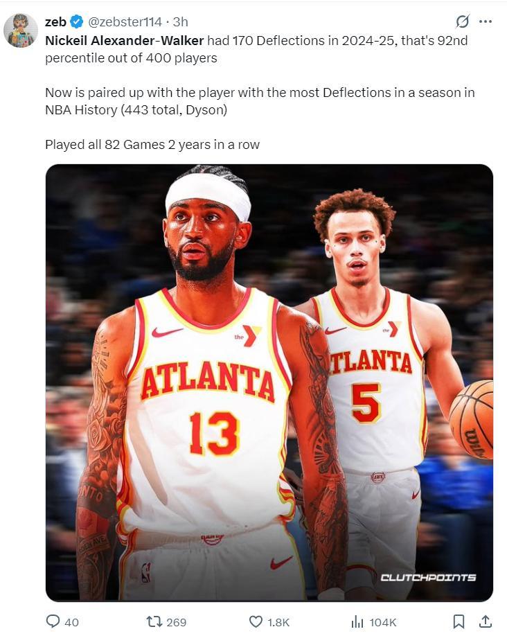 上賽季沃克是森林狼最主要的外線防守者,在400位球員中排名第92,而上賽季外線防守最出色的正是老鷹後衛戴森-丹尼爾斯,如今這兩人將在一支球隊。