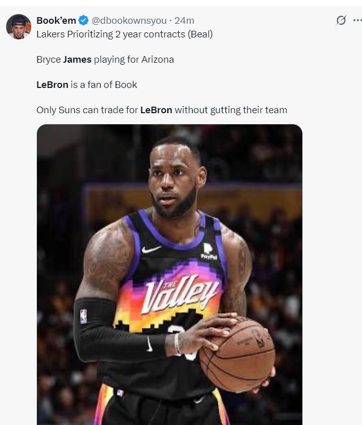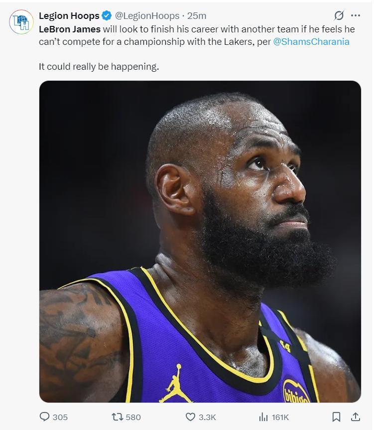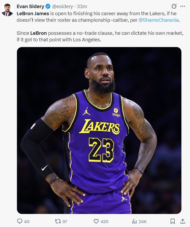 隨後Shams透露。如果勒布朗-詹姆斯覺得無法再湖人隊繼續爭奪總冠軍,他可能會選擇轉投其他球隊結束自己的職業生涯。