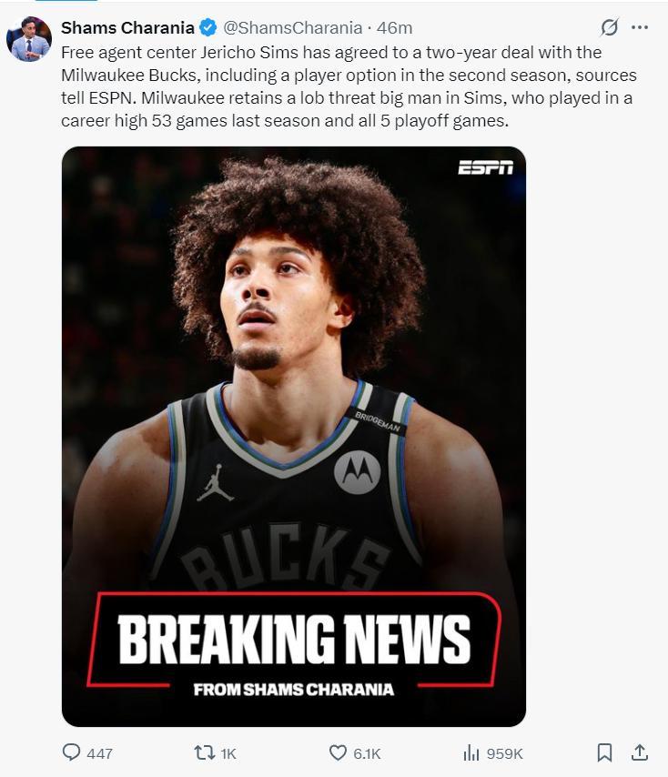 截止北京時間7月2日凌晨1點30分,密爾沃基雄鹿隊的運作纔有所停滯,他們剛剛用康諾頓+2個次輪籤(2031年與2032年)松島夏洛特黃蜂隊換來了控球后衛瓦西里耶-米西奇。米西奇2023年離開歐洲後與雷霆簽約,之後輾轉太陽、黃蜂,今夏剛剛被太陽在馬威的交易中送回黃蜂。