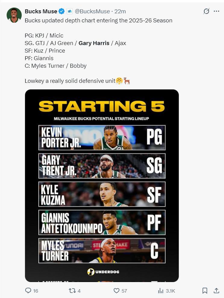 新賽季雄鹿的潛在先發:小波特、特倫特、庫茲馬、字母哥、特納,攻防的硬實力都還行。