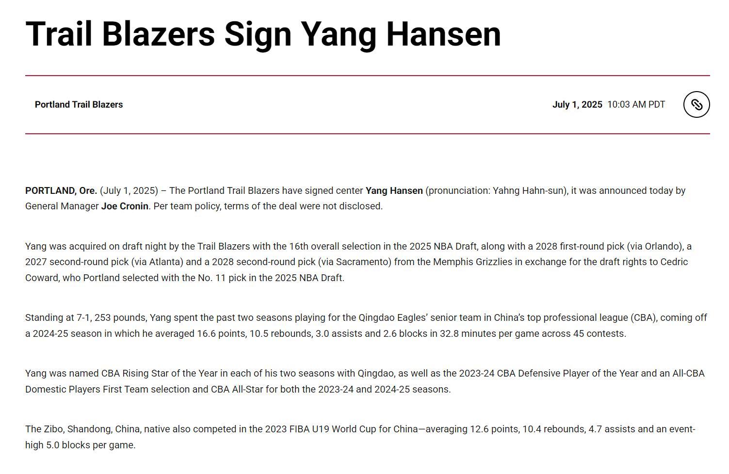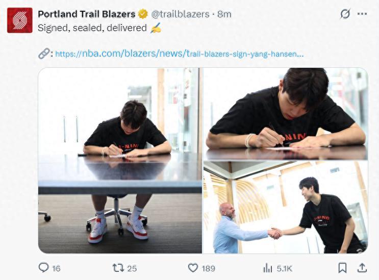 開拓者官方寫道:開拓者已經簽下楊瀚森,由總經理喬-克羅寧根據球隊的政策簽約楊瀚森,簽約的細節條款沒有披露。