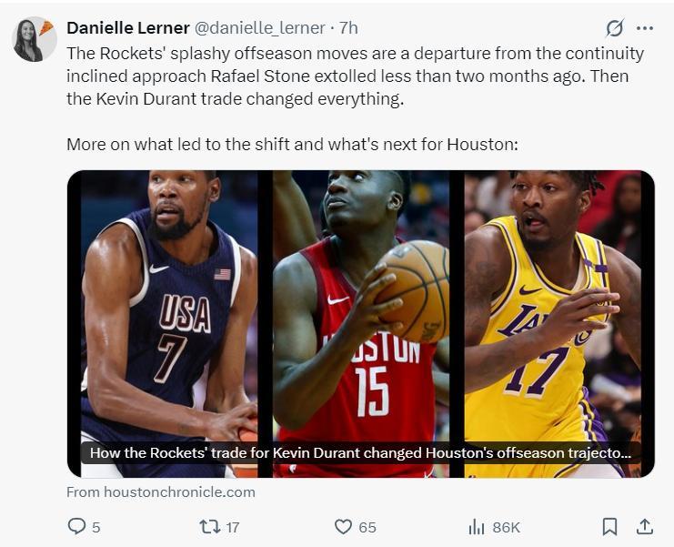 火箭總經理拉斐爾-斯通在今年休賽期成爲王者,他不僅換來了凱文-杜蘭特還簽下了芬尼史密斯與卡佩拉,火箭隊的陣容變得十分充盈,而且斯通還沒有結束運作,目前球隊正在積極兜售惠特莫爾、蘭代爾等人。