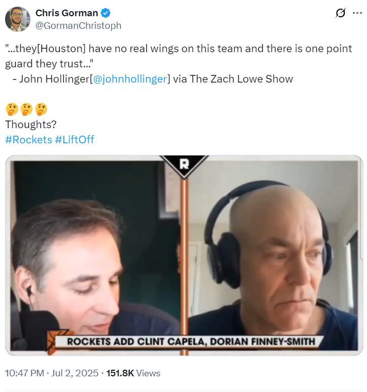 前ESPN名記約翰-霍林格在扎克-洛維的播客中談到火箭的問題——他們真正意義上的控球后衛實際上只有範弗利特一人,謝潑德與霍勒迪都不是純正的一號位。