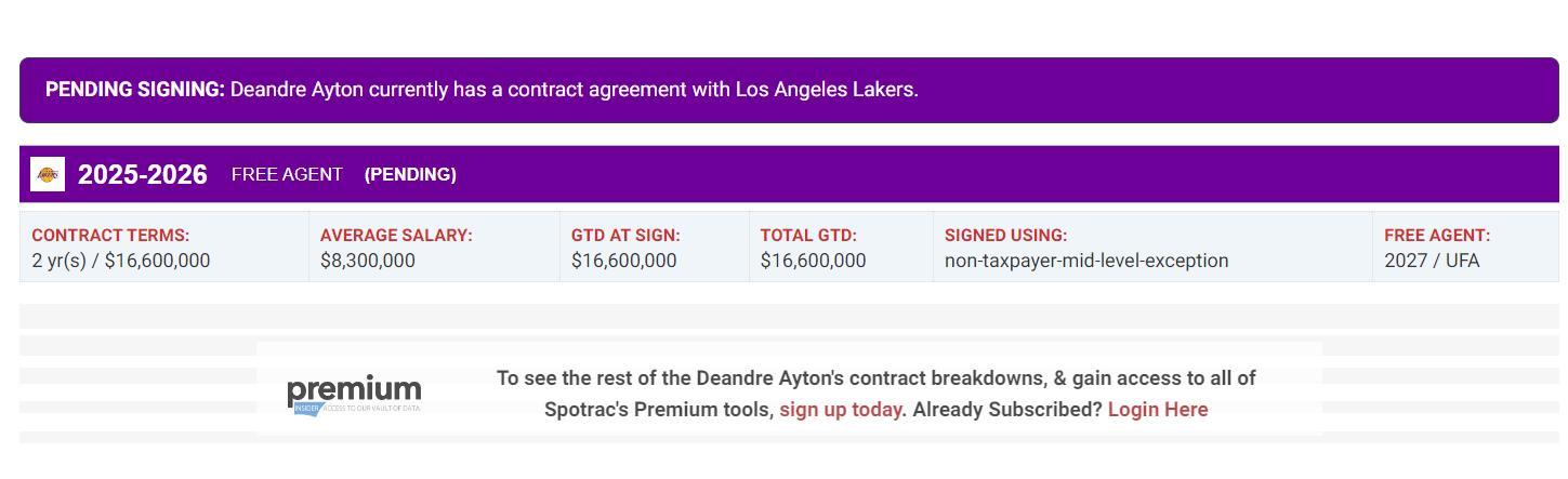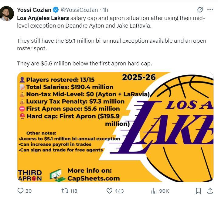 根據薪資結構專家的報道,湖人使用中產特例的簽下了艾頓與拉拉維亞兩人,湖人還有一份510萬的雙年特例可以使用,球隊也只剩下一個名額,湖人比第一奢侈稅線還差560萬美元。