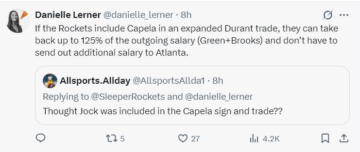 火箭隊記Danielle Lerner透露,如果火箭將老鷹拉入KD的交易,那麼火箭可以收回薪資總額的125%不需要再向老鷹支付額外的現金資產。
