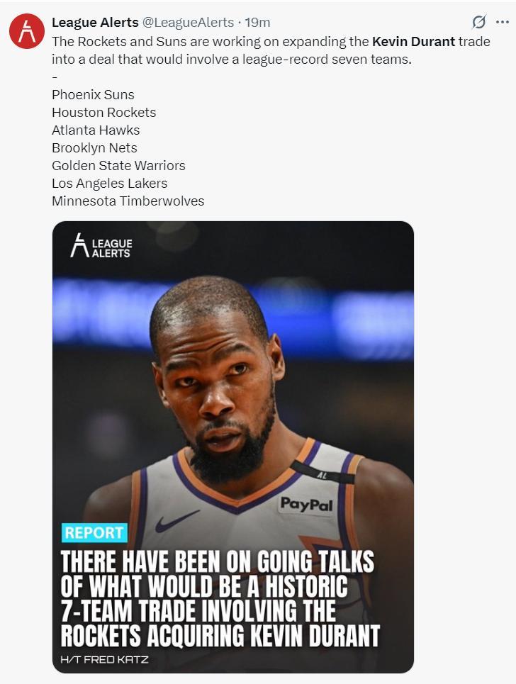 北京時間7月3日,TA記者Fred Kztz報道,太陽/火箭關於杜蘭特的交易還沒有正式達成,火箭與太陽正在努力將多支球隊拉入交易,有希望達成NBA歷史第一次七方大交易,此前聯盟最多的是6方交易,若7方交易達成將創造NBA紀錄。