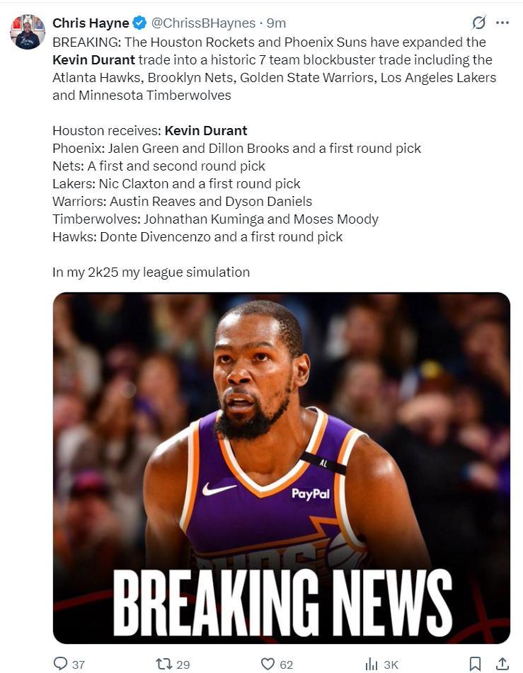 美記克里斯-海耶斯自己用2K25模擬了這筆7方大交易——(他認爲這樣的7方交易纔是全贏的局面)