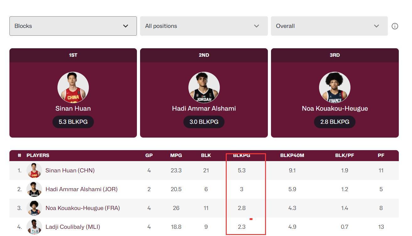 四場比賽下來郇斯楠合計已經送出21個封蓋,場均要送出5.3個,他在這屆世界盃封蓋榜上斷崖第一,排在第二的約旦球員阿爾沙米場均是3個蓋帽,只有這兩人場均能上3+封蓋。