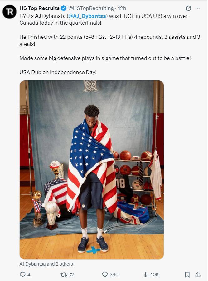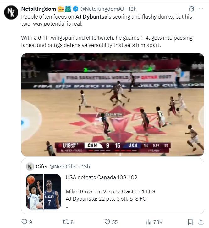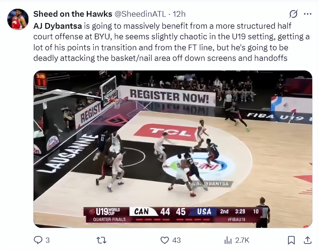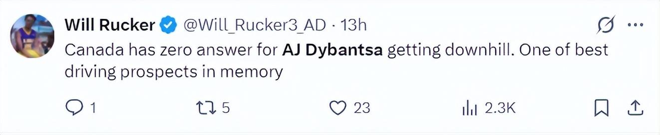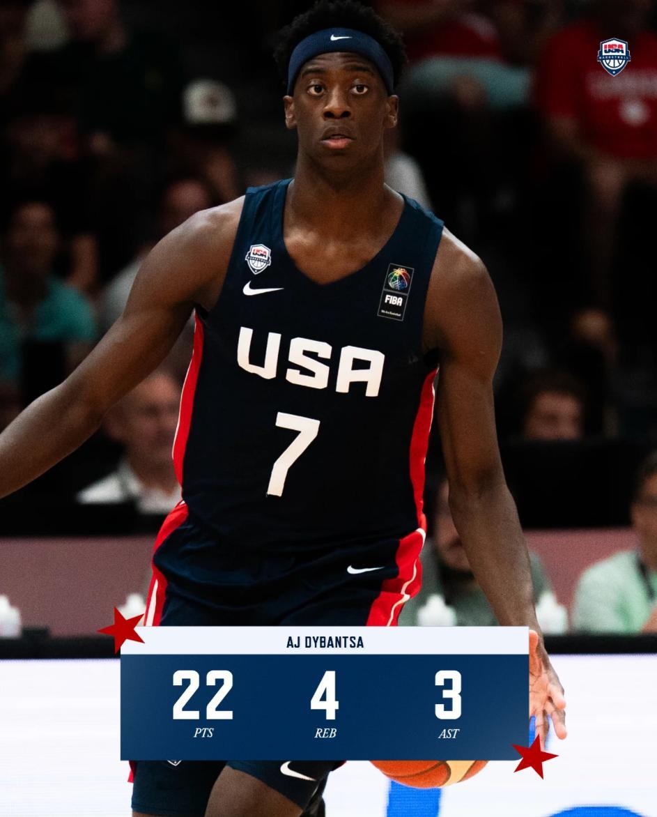 迪班薩這場最強一戰引來美媒的盛讚:迪班薩在高中聯賽上半場進攻又戰術存在巨大有優勢,來到U19表現有些混亂主要依靠快攻、造犯規拿分,不過他在低位借掩護順下攻框的效果很好。