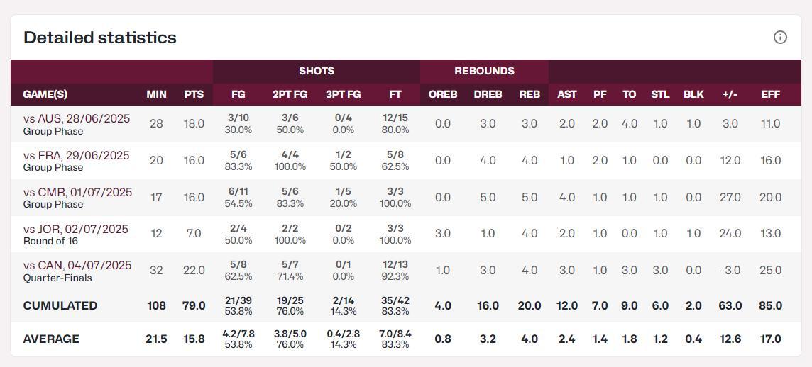 此役迪班薩打了22分鐘,8中5,罰球13中12,拿到22分4籃板3助攻3搶斷,命中率62.5%,他整個末節是8罰7中,世界盃罰球命中率高達83.3%,美中不足是三分球14中2。