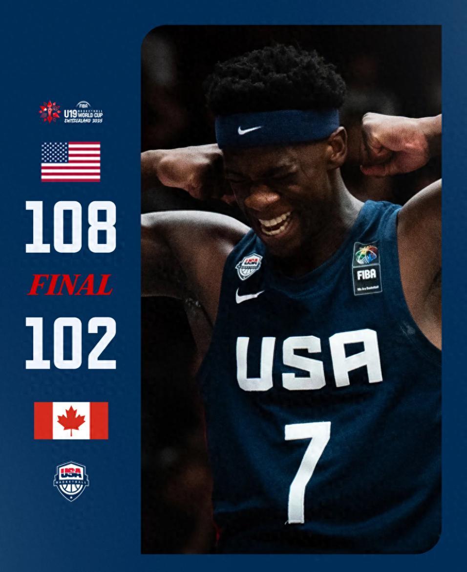 美國U19男籃108-102險勝加拿大U19男籃晉級半決賽,這場比賽美國隊與加拿大隊打得非常膠着,上半場打完美國領先7分,第三節打完加拿大縮小到1分,末節兩隊僵持到最後一刻,終場前2分41秒加拿大隻落後2分而已,決勝時刻還是球隊領袖迪班薩挺身而出,他不斷突破製造殺傷以罰球幫助球隊取勝。