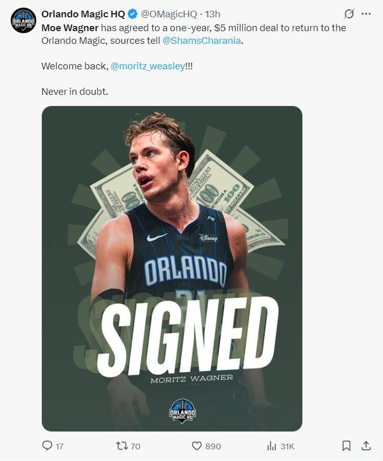 北京時間7月5日,奧蘭多魔術隊與莫里茨-瓦格納達成了一年500萬的續約合同,早些時候魔術放棄了大瓦價值1100萬的球隊選項,大瓦進入自由市場後並沒有引起太多的波瀾,最終他選擇大幅降薪迴歸奧蘭多。