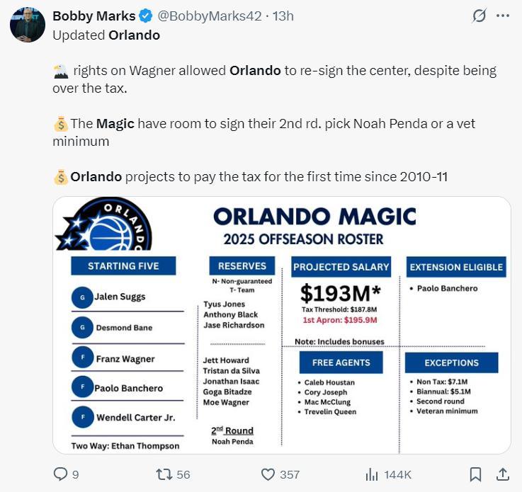 根據薪資結構專家鮑比-馬克斯的說法,簽下大瓦後魔術隊只剩下底薪空間來簽下第15人。看魔術GM安東尼-帕克怎麼運作了。