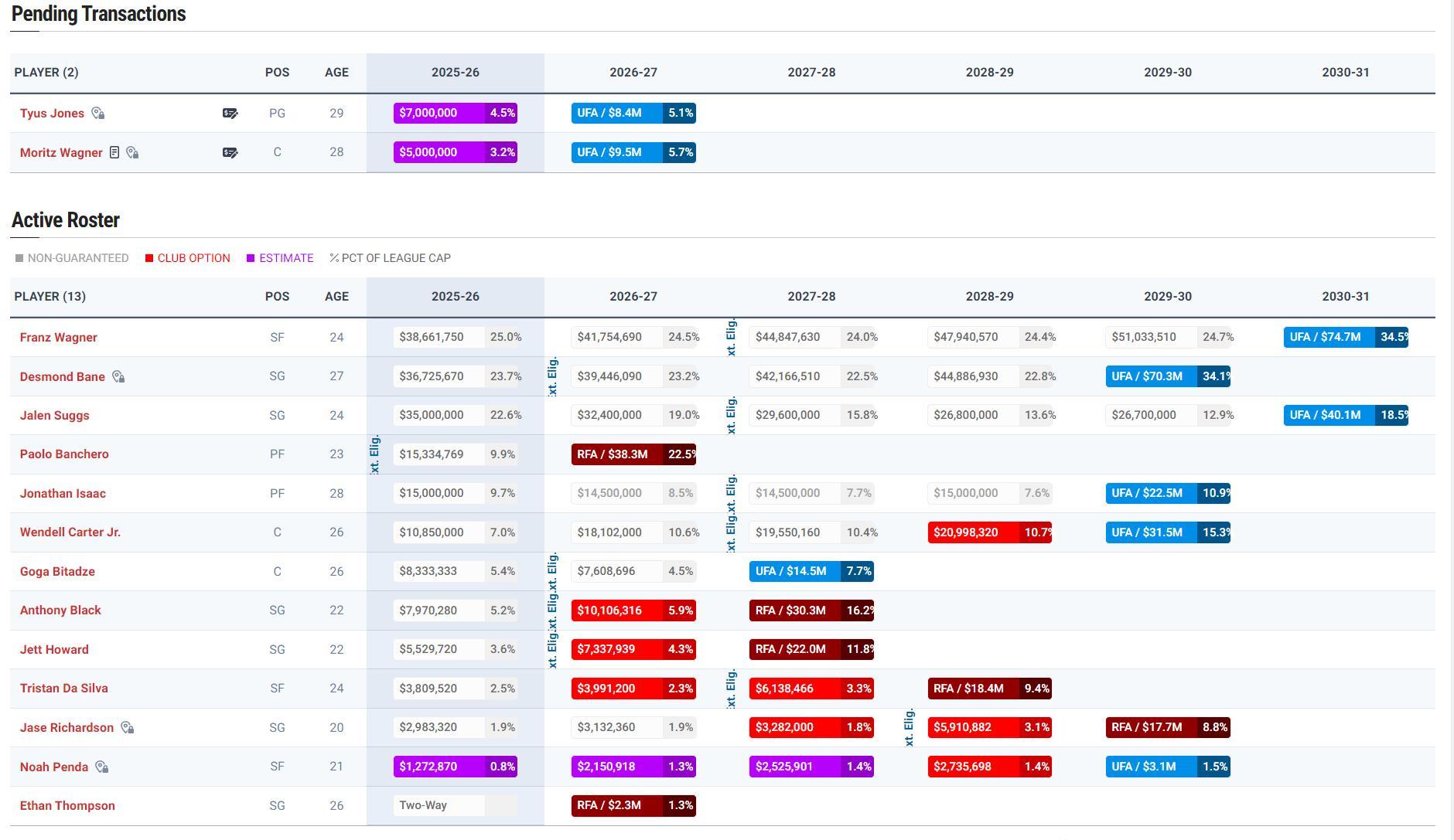 身高2.01米的龐達是2-3號,他作爲次輪秀與魔術簽下了四年868萬的合同,25-26賽季127萬、26-27賽季215萬、27-28賽季252萬、28-29賽季273萬。最後一年是球隊選項。