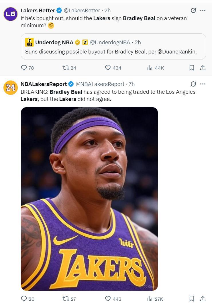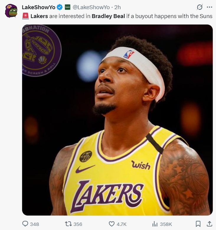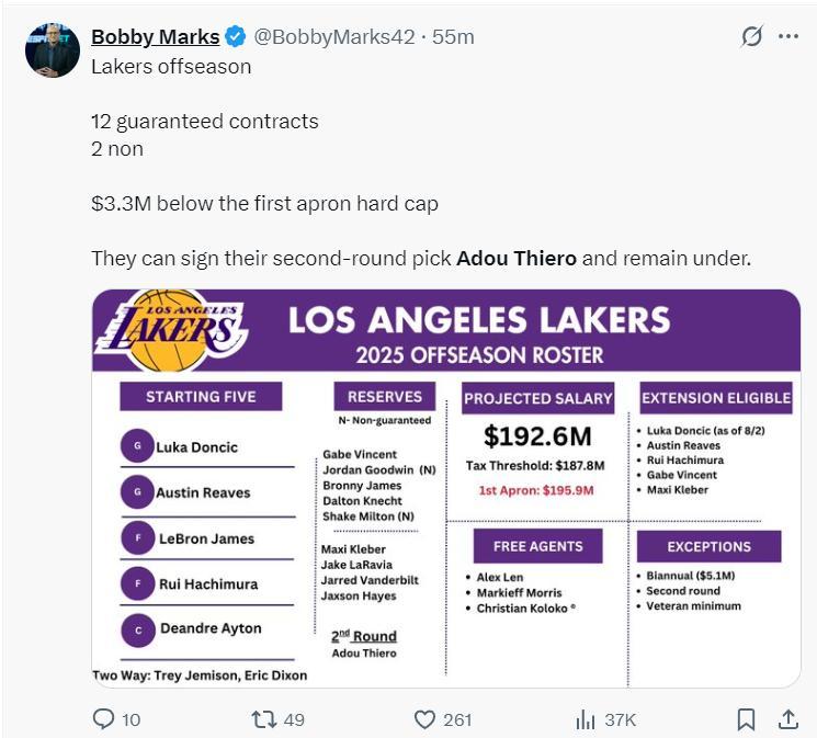 湖人隊在今夏已經完成了一些運作:參與KD的7方大交易讓55號籤成爲36號籤選中蒂耶羅、兩年1200萬簽下拉拉維亞、兩年1660萬簽下艾頓、一年300萬底薪籤回海斯,如今湖人隊還在等待布拉德利-比爾。