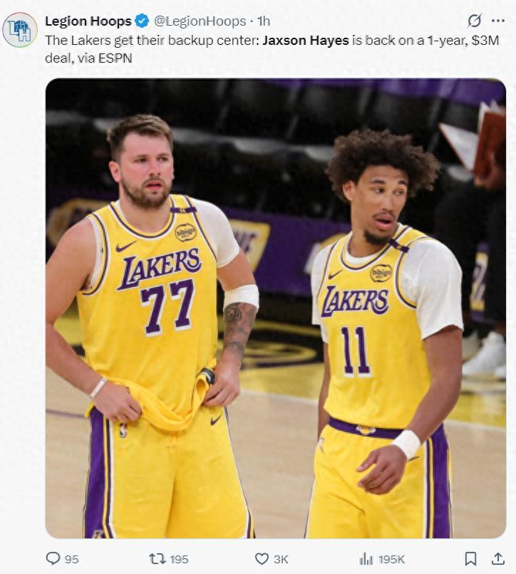 北京時間7月4日,根據ESPN的報道,賈克斯-海斯以一年的底薪合同300萬迴歸洛杉磯湖人隊,海斯的經紀人已經在美國時間週四與湖人完成簽約,上賽季海斯命中率高達72.2%創造生涯新高,新賽季他會成爲艾頓的替補。