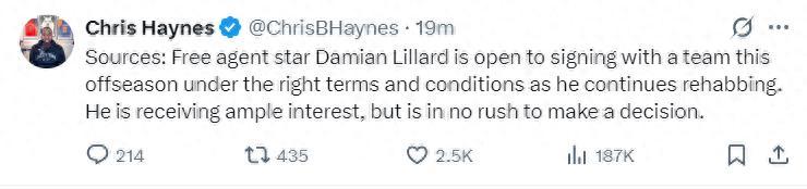 北京時間7月4日,NBA記者克里斯-海耶斯報道,目前達米安-利拉德已經收到了來自多支球隊的邀請,可他並不着急做決定,他對在休賽期加盟適合的球隊持開放態度。