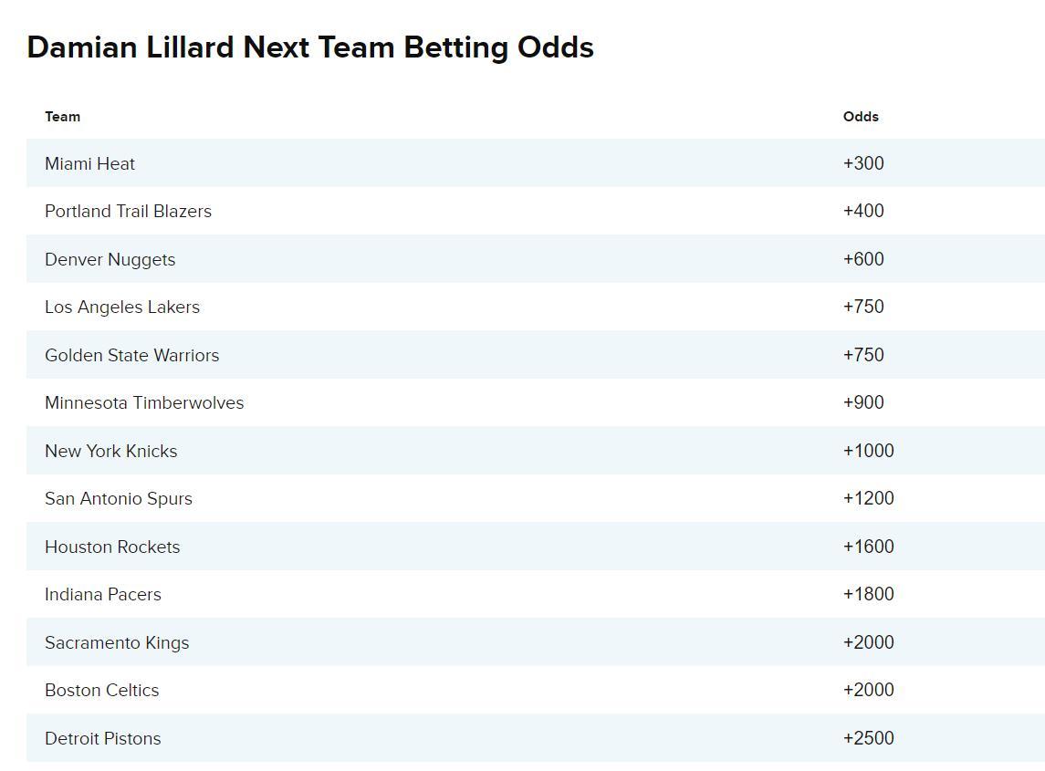 北京時間7月4日,利拉德的下家賠率已經更新:熱火+300第一,開拓者+400第二,掘金+600第三,湖人+750第四,勇士+750第五,森林狼+900第六,尼克斯+1000第七,馬刺1200第八,火箭+1600第九,步行者+1800第十,國王+2000第十一,綠凱+2000第十二,活塞+2500第十三。