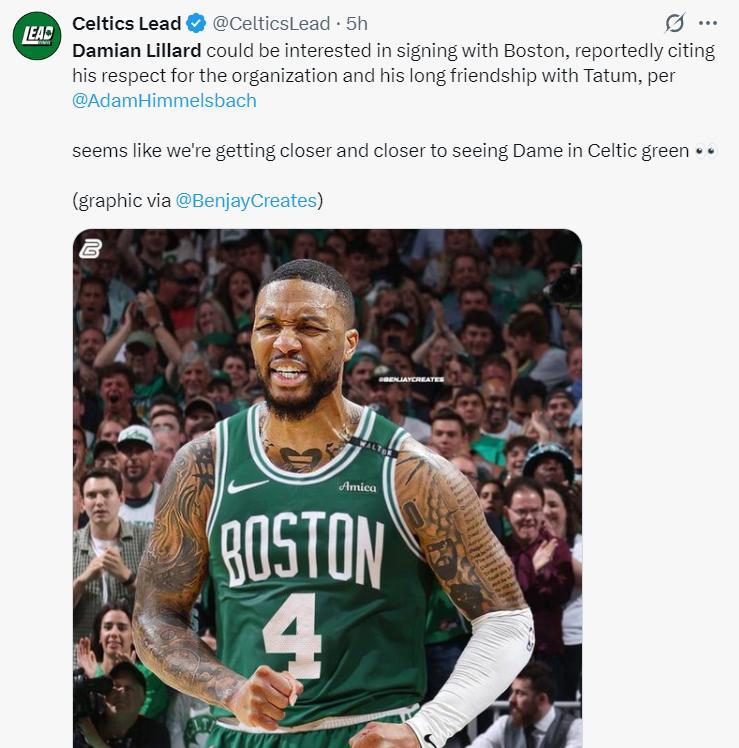 五小時之前,波士頓凱爾特人記者AdamHimmelsbach爆料,利拉德預計將跟綠凱簽約,因爲利拉德與塔圖姆的私交甚篤,這兩人目前都在恢復跟腱的傷情,兩人的康復訓練可以一同進行。