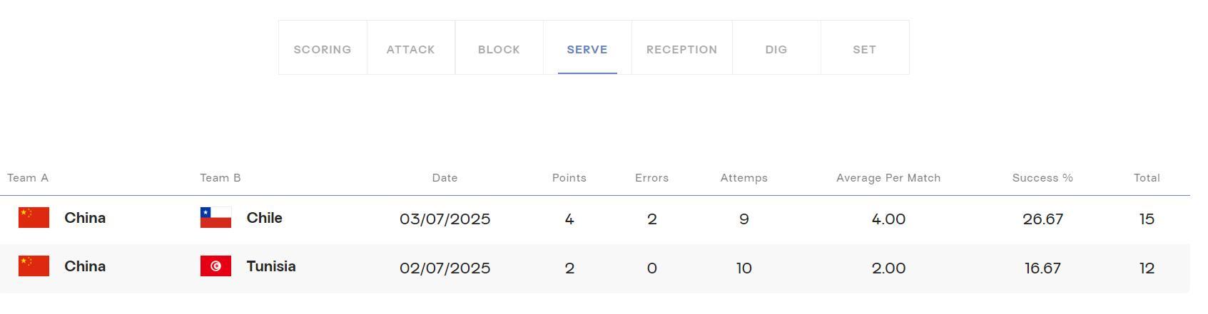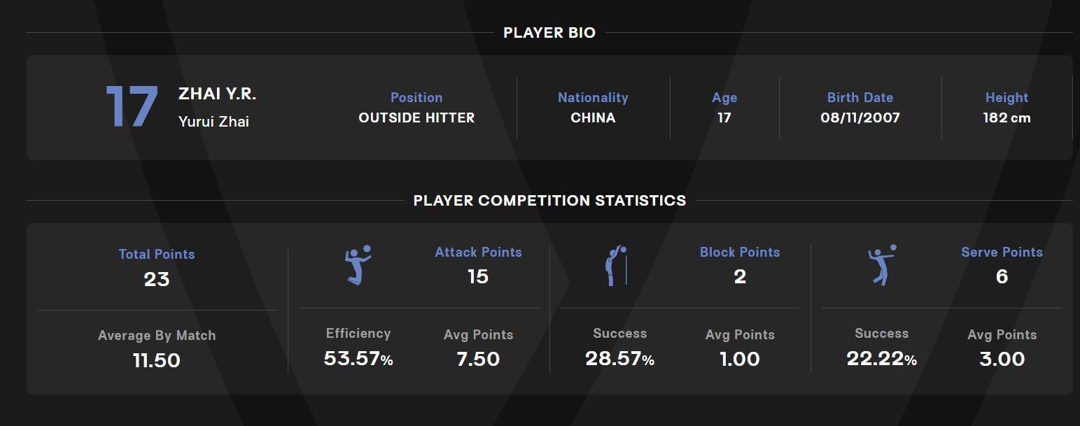 具體數據爲:金佳寶14分,16扣9中4失誤被攔+2攔3發;翟宇睿13分,15扣9中3失誤被攔+4發,曹燁軒8分,黃悅鑫7分,郭中楠5分,李一依2分。