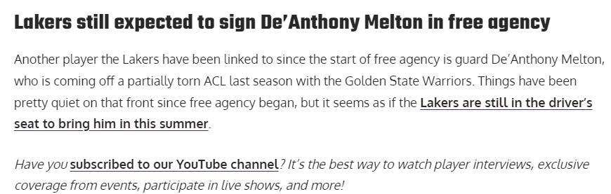 除此之外,湖人對自由球員梅爾頓也感興趣,湖人也有希望能簽下梅爾頓這位後衛。