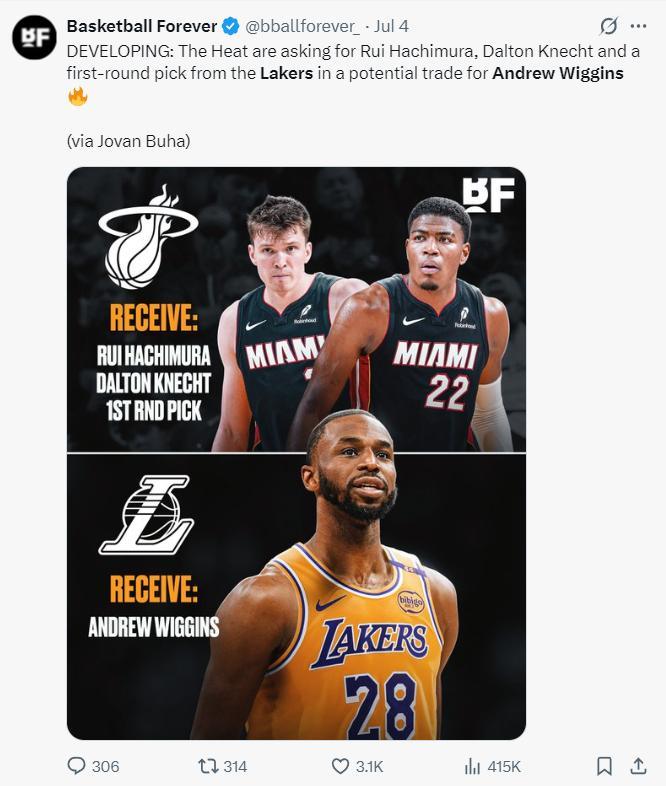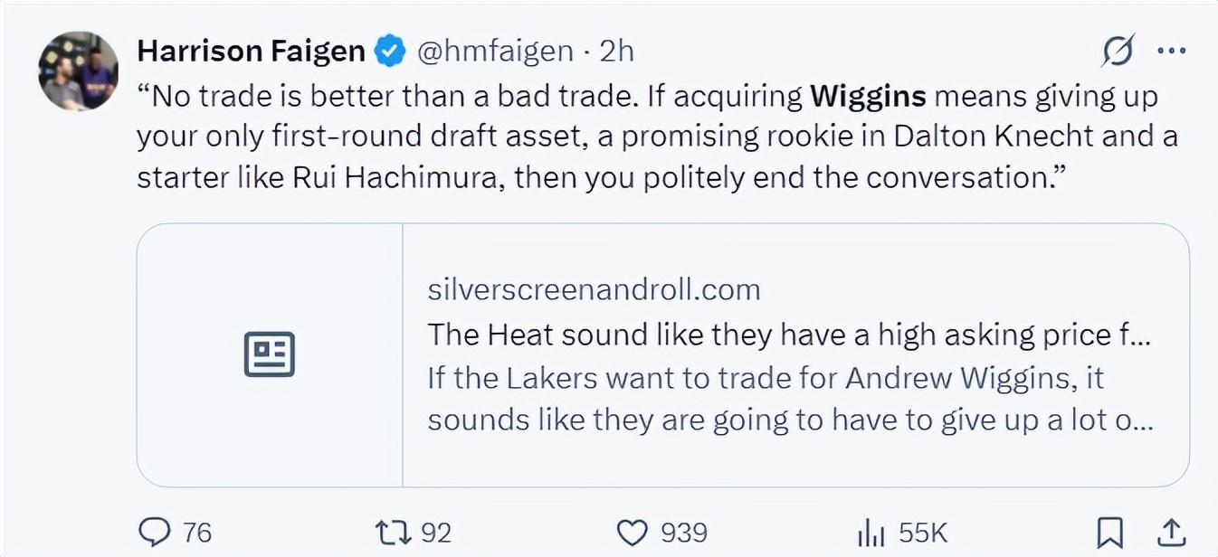 除此之外,哈里森-費根還談到了湖人/熱火關於安德魯-維金斯的交易,熱火索要道爾頓-克內克特、八村壘、一個未來首輪籤,湖人認爲要價過高沒有繼續深入討論。