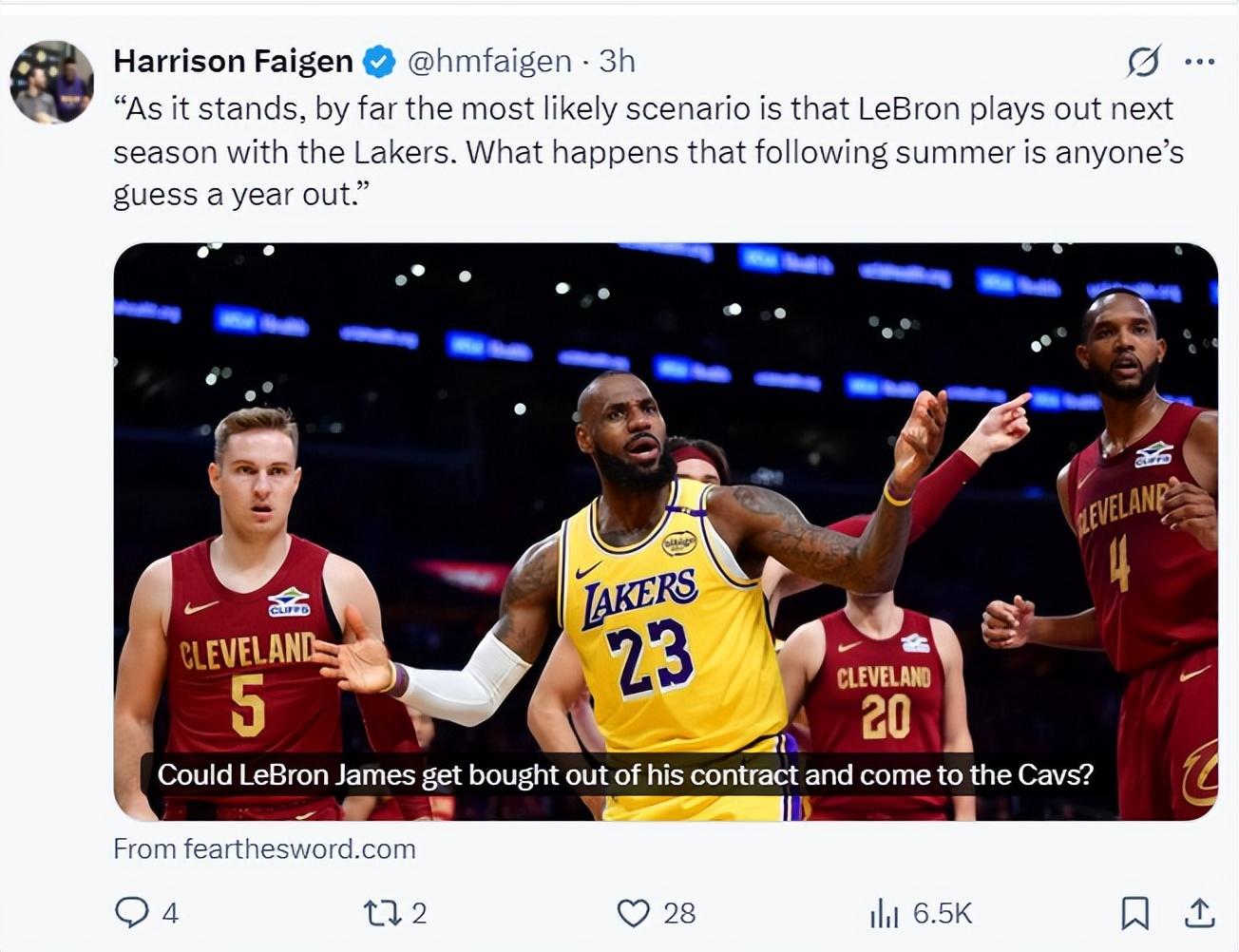 湖人記者哈里森-費根轉發了這篇文章後寫道:“按目前的情況看,勒布朗下賽季最可能得還是留在洛杉磯湖人隊。至於明年夏天會發生什麼還不說,一年後的事情誰也說不準。”