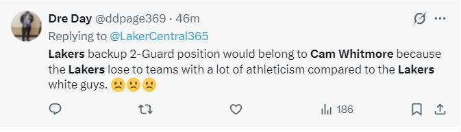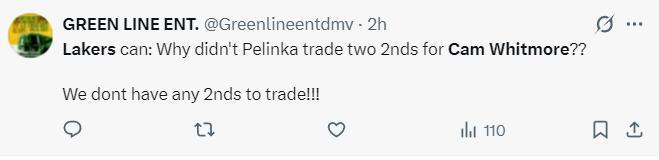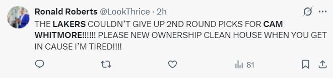 湖人球迷:湖人隊不願意放棄兩個次輪籤來換惠特莫爾,拜託新的管理層你們接手球隊後好好整頓一下,我們已經受夠了。