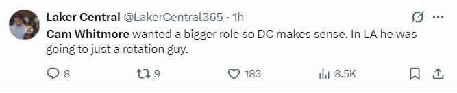 在白魔被送到奇才後,湖人球迷、湖人媒體都在熱議球隊未出手。(三天之前湖人隊記安東尼-勞瑞恩就說白魔可能會進入KD大交易成爲芬尼史密斯的籌碼,當時湖人球迷十分開心,結果這份大交易的籌碼曝光後並沒有白魔,火箭是裸簽了芬尼史密斯)