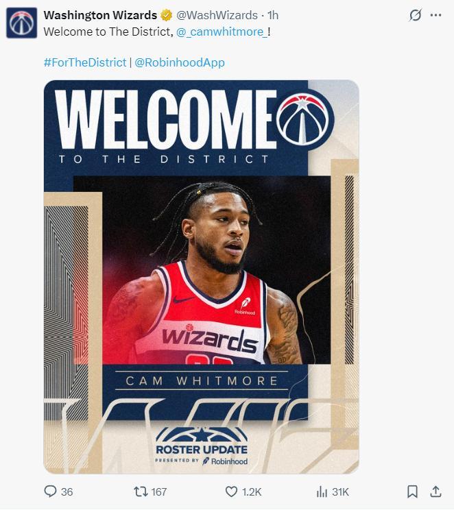 奇才官方也歡迎了白魔,官方寫道這位身高6尺7的鋒衛搖擺人在火箭打了兩個賽季,他是2023年首輪20號秀,出場98次,場均10.8分3.4籃板,在24-25賽季三次先發中場均拿到25分8籃板2助攻,命中率58%,這位馬里蘭州的本地人被認爲是2023屆最強之一。