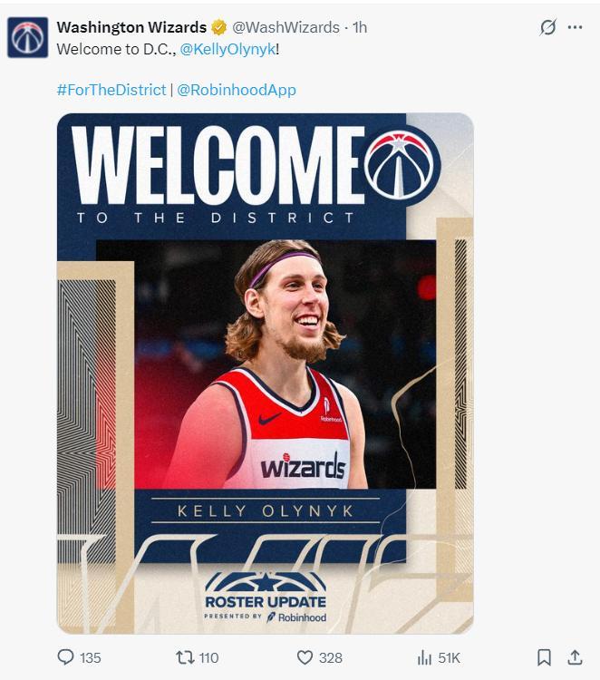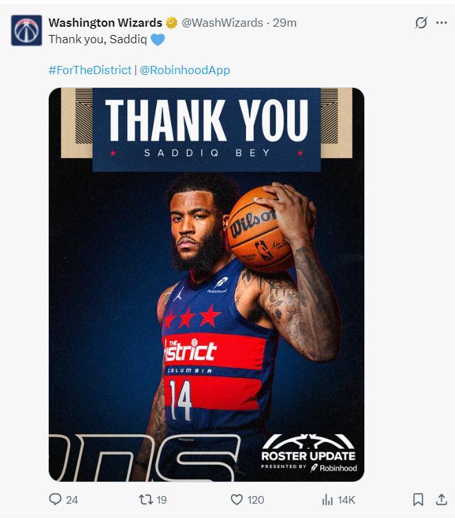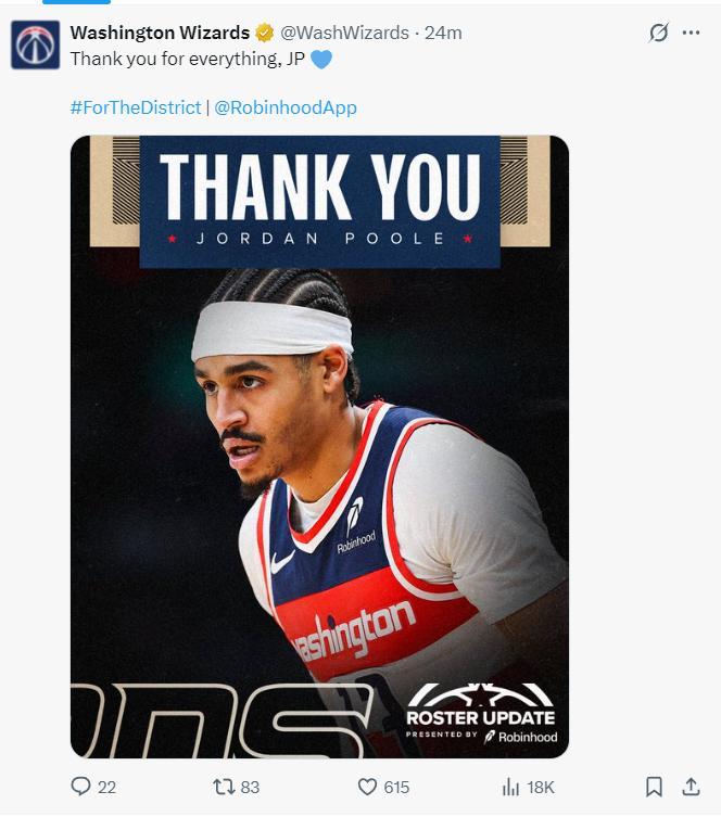 奇才官方也感謝了普爾與薩迪克-貝的付出,尤其是普爾在奇才兩個賽季打了146場比賽,場均18.8分4.4助攻,他是2023年7月被交易到奇才的。