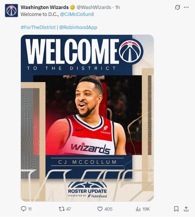 奇才官方也歡迎了CJ,還寫道這位6尺3的後衛已經在波特蘭+新奧爾良打了12個賽季,787場比賽有690場先發,場均19.6分3.6籃板3.8助攻,三分命中率39.7%,上賽季他作爲鵜鶘先發場均21.1分4.1助攻3.8籃板。