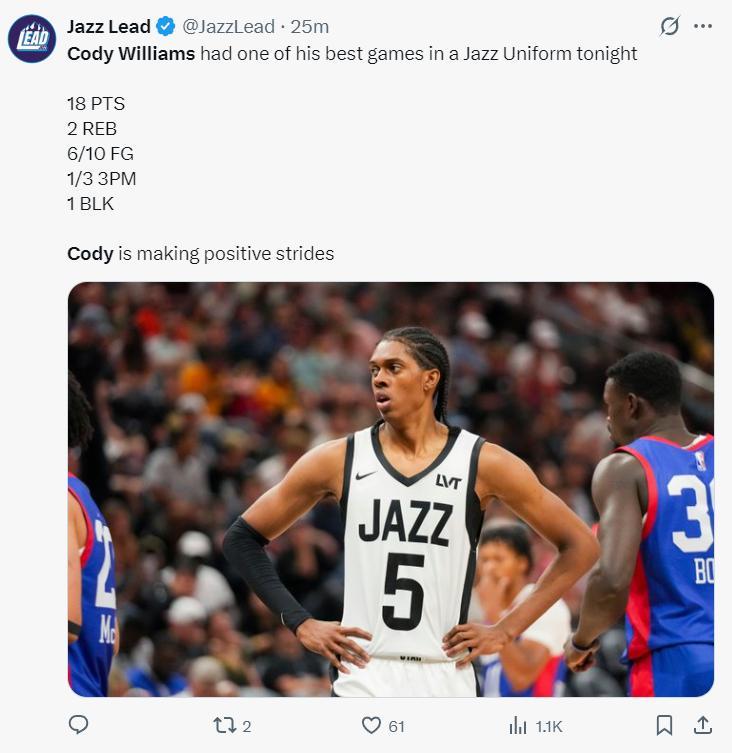 順位第二高的就是2024年首輪第10順位的科迪-威廉姆斯,他是雷霆二當家傑威的弟弟,可他上賽季在爵士連主力輪換都打不上,此役他31分鐘,10中6,三分3中1,拿到18分2籃板0助攻1蓋帽,他打出了過去13個月最好的一場比賽。