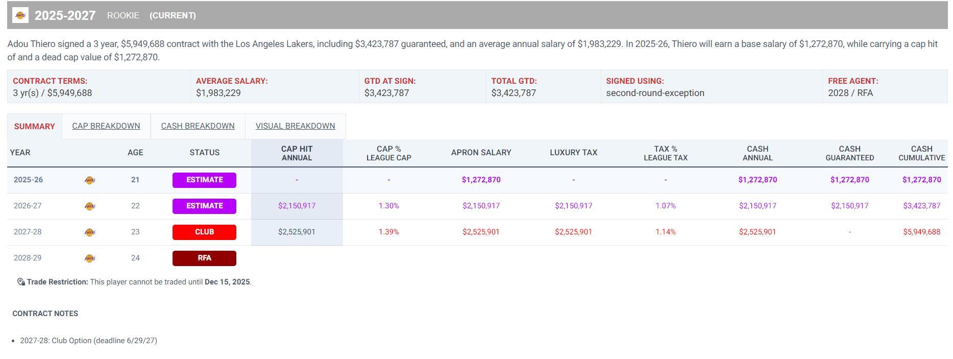 這份合同是2+1,第三年的球隊選項,下賽季蒂耶羅薪水128萬,26-27賽季219萬、27-28賽季252萬(球隊選項),蒂耶羅在NCAA場均出戰27.5分鐘,可以得到15.1分5.8籃板1.9助攻1.6搶斷0.7蓋帽,投籃命中率54.5%,三分命中率25.6%是一個缺乏投射能力的側翼,裸足1.9975米。