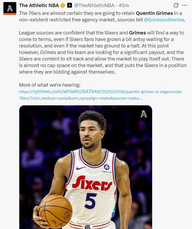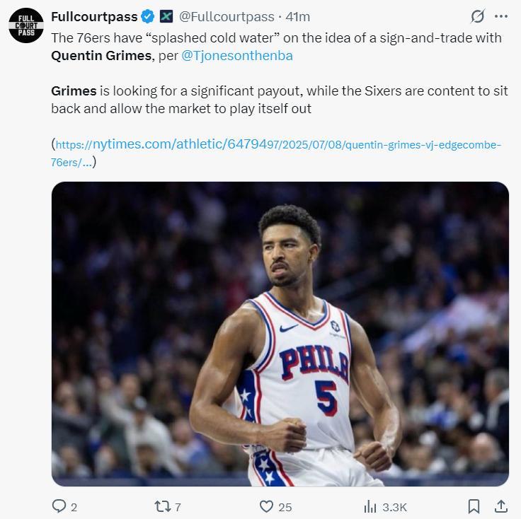 TA費城記者Tjones爆料,費城已經否定了格蘭姆斯進行先簽後換的提議,他們採取繼續觀望的態度。