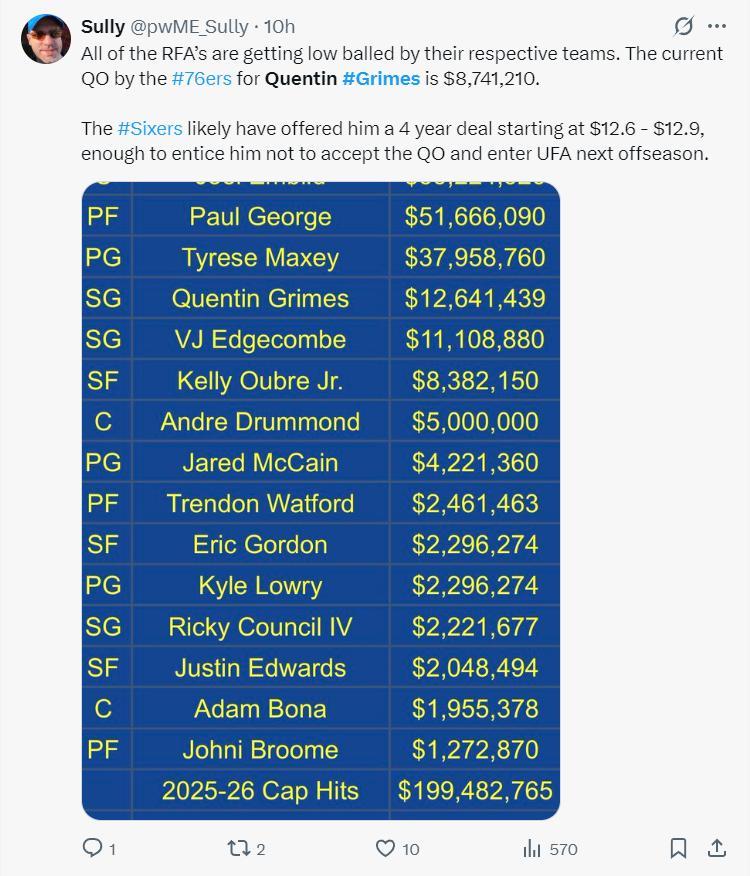 費城媒體透露,球隊給了格蘭姆斯874萬的資質報價讓他成爲受限制的自由球員,但自由市場上沒有球隊願意給格蘭姆斯高薪,費城很可能給了格蘭姆斯一份四年均薪1260-1290萬的合同,也就是四年5000萬-5100萬左右的合同。【只要費城拒絕籤換,最終格蘭姆斯只能接受他們開出的續約合同】